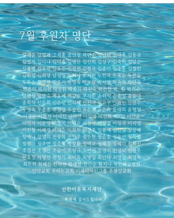 2025년도 7월 후원자명단 페이지 정보 작성자 관리자 작성일25-08-04 15:57 조회1,184회 댓글0건 관련링크 이전글 다음글 목록 본문 7월 후원자 명단입니다. 댓글목록 등록된 댓글이 없습니다. 이전글 다음글 목록